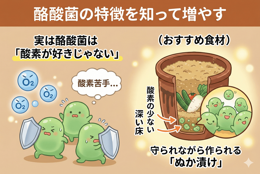 次に摂りたいのは酪酸菌ですが、実は酪酸菌は「嫌気性(けんきせい)」という性質を持っており、「酸素が好きじゃない」んです。