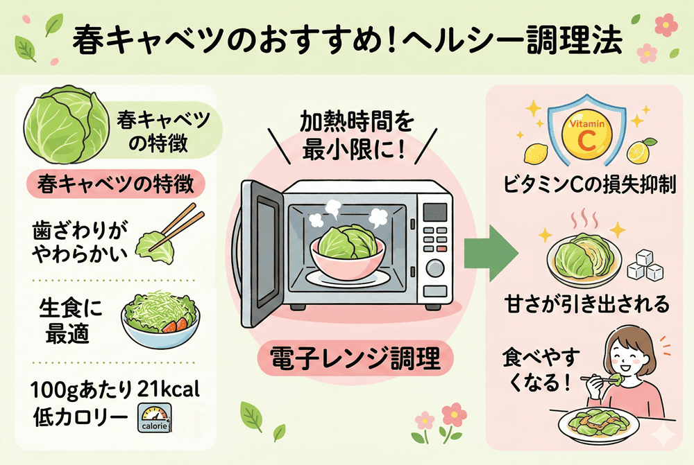 キャベツに豊富に含まれているビタミンCは加熱すると減ってしまいますが、春キャベツなら生食しやすく、ビタミンC補給として重宝します。