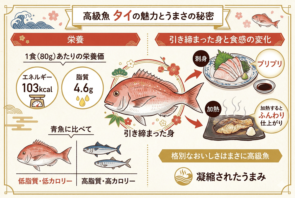 タイ1食(80g)あたりのエネルギーは103kcal、脂質は4.6gであり、青魚に比べて低脂質・低カロリー。