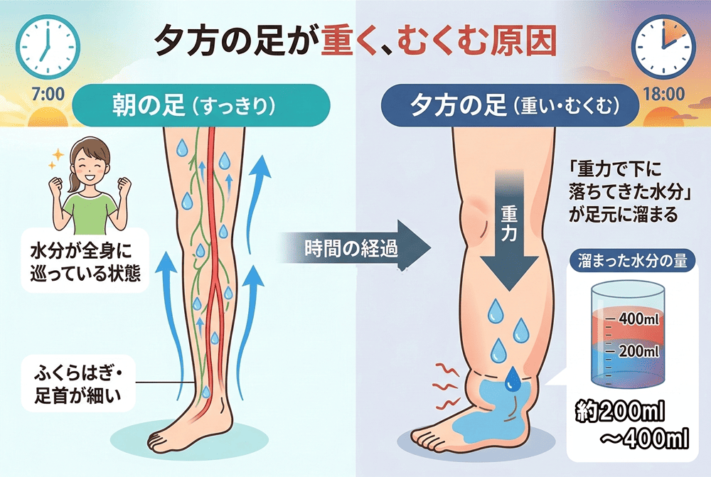 夕方の足が朝に比べて重く感じるのは、実は「重力で下に落ちてきた水分」が足元に溜まっているからです。
