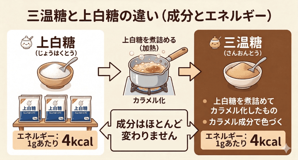 実は”三温糖”は上白糖を煮詰めてカラメル化したもので、成分はほとんど上白糖と変わりません。