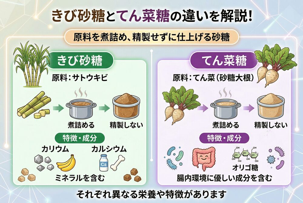 きび砂糖はカリウムやカルシウムを含んでおり、てん菜糖はオリゴ糖を含んでいることがメリットといえます。