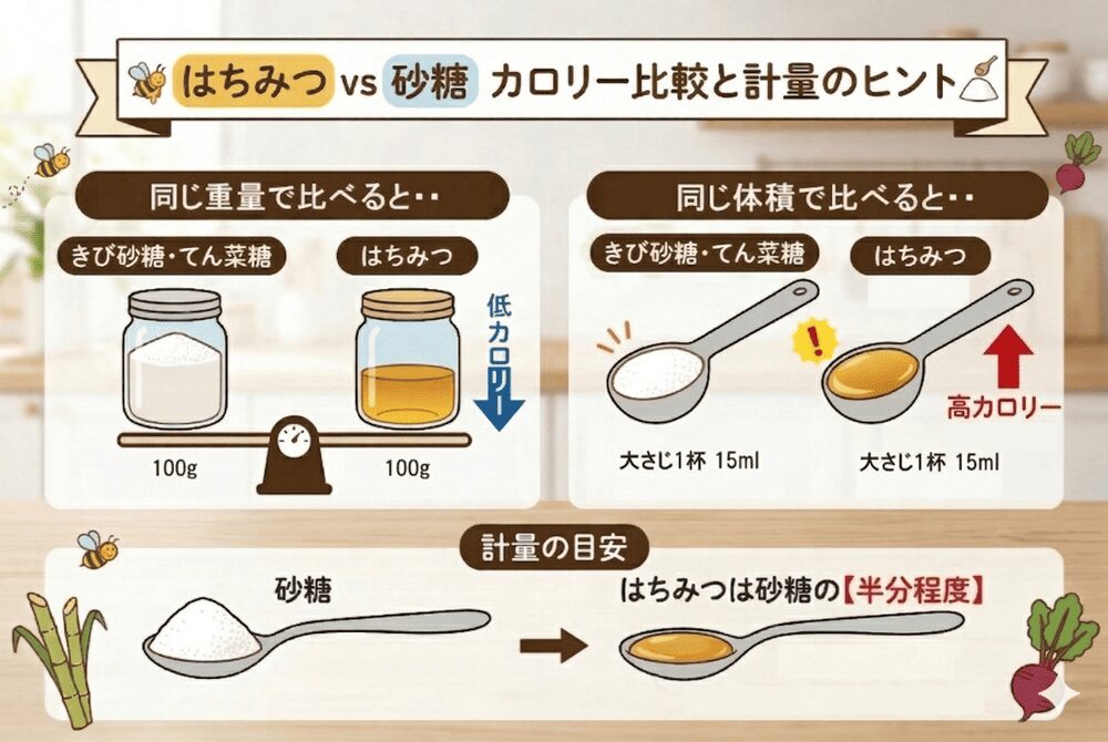 はちみつはきび砂糖やてん菜糖よりも甘味が強く、同じ重量で比べると低カロリー。