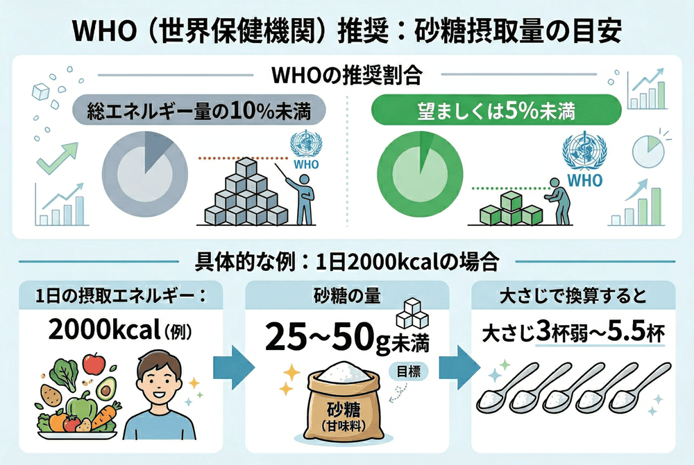 例えば、1日のエネルギー量が2000kcalの場合、砂糖の量は25~50g未満に抑えることが目標となり、大さじ3杯弱から5.5杯が目安です。