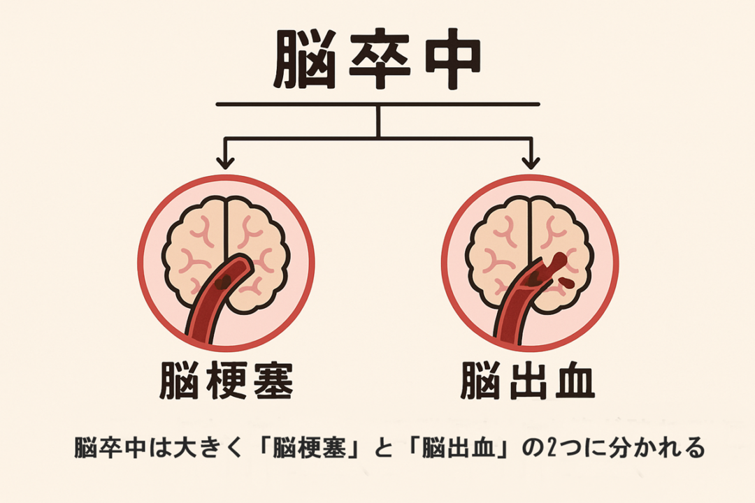 脳卒中は、血管が詰まる脳梗塞と、血管が破れる脳出血に大きく2つに分かれます。