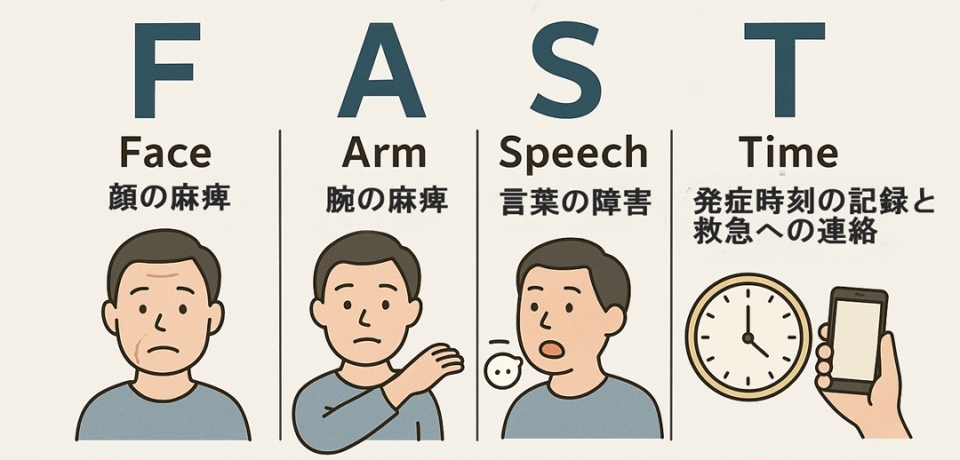 Face(顔の麻痺)、Arm(腕の麻痺)、Speech(言葉の障害)、Time(発症時刻の記録と救急への連絡)の頭文字を取ってFASTとよんでいます。