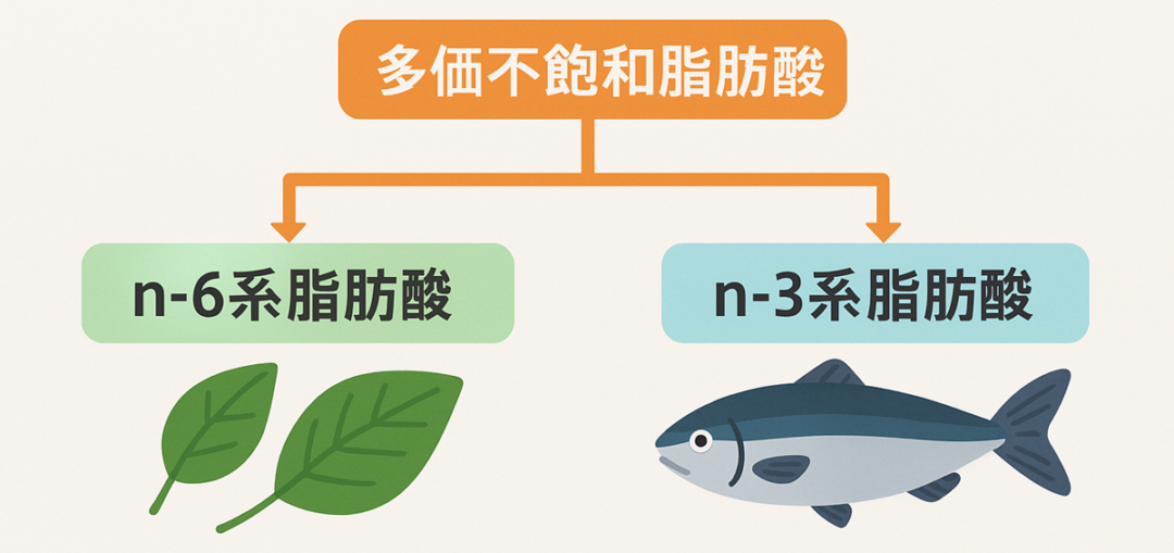 n-6系脂肪酸とn-3系脂肪酸に分けられ、どちらも食品から取り入れる必要のある脂質です。