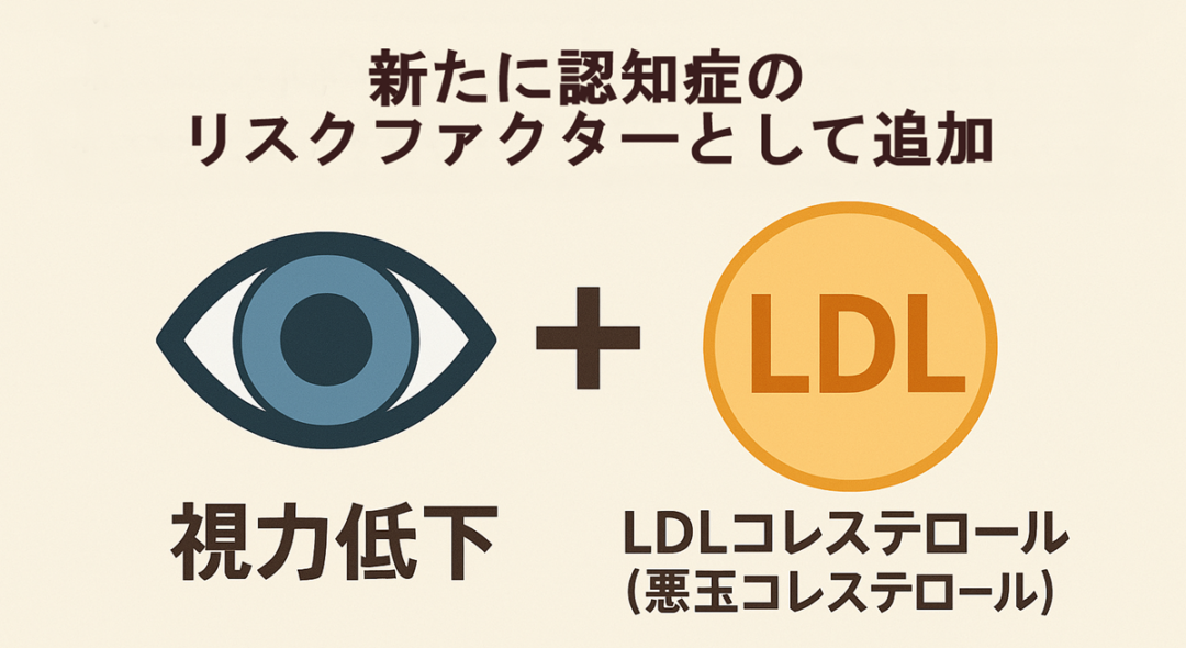 2020年から2024年にかけて、新たに認知症のリスクファクターとして取り上げられたのは、視力低下とLDLコレステロール(悪玉コレステロール)値の高さです。