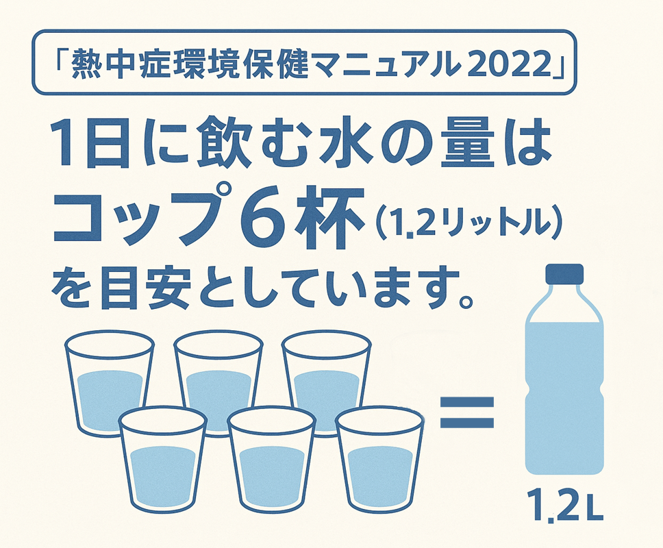 「熱中症環境保健マニュアル2022」において、1日に飲む水の量はコップ6杯(1.2リットル)を目安としています。